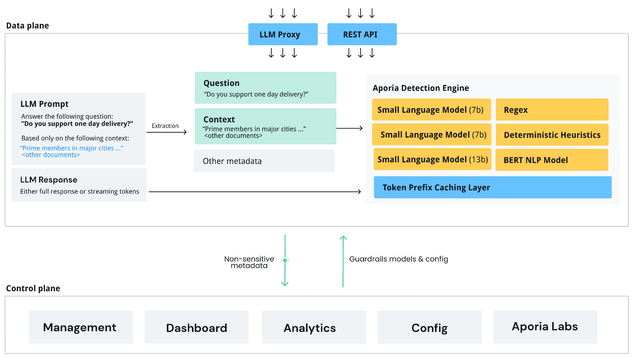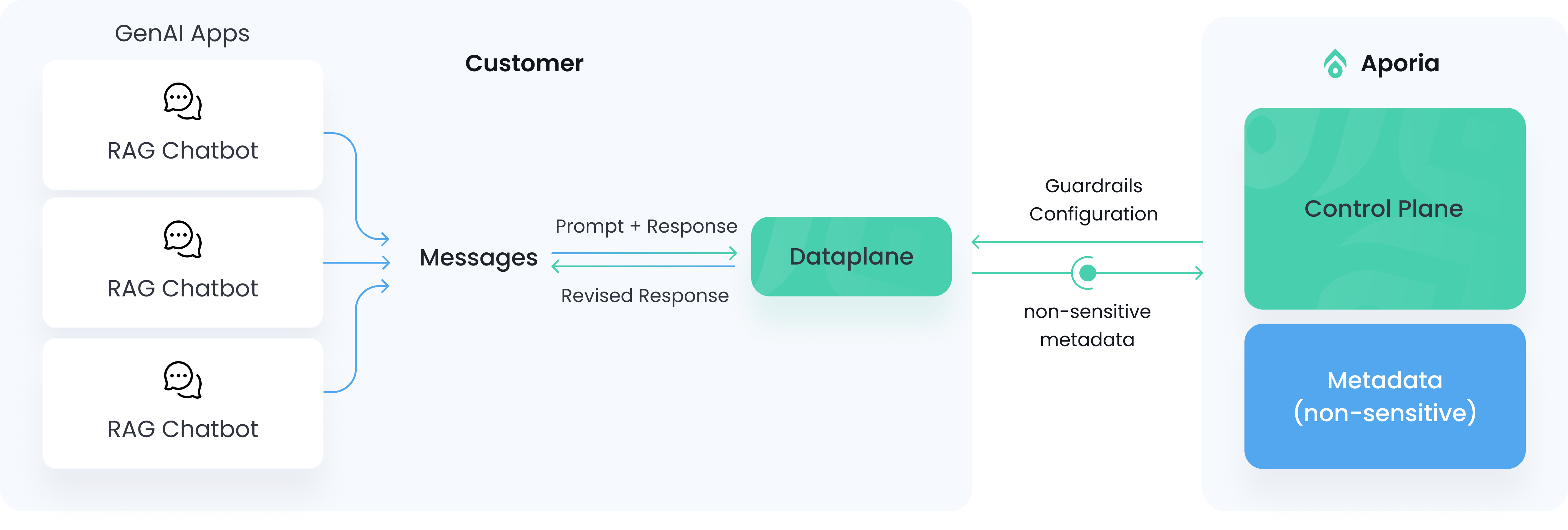 The Aporia architecture is split into two planes to avoid sensitive data exposure and simplify maintenance.- The control plane lives in Aporia’s cloud and serves the policy configuration, along with the UI and metadata.