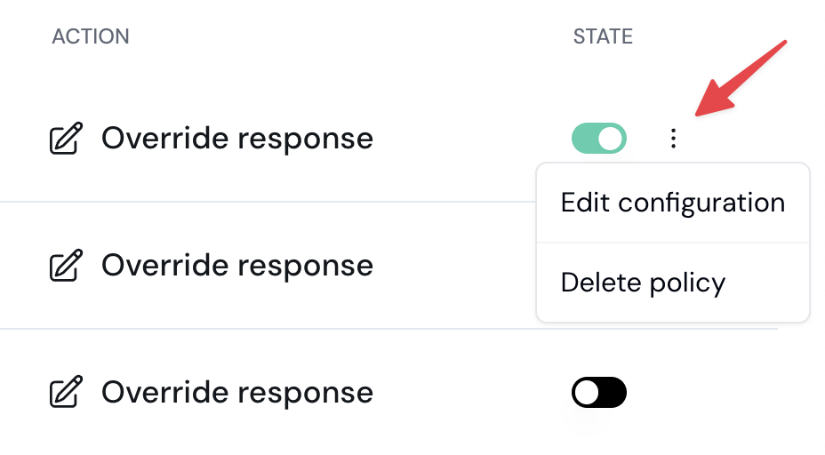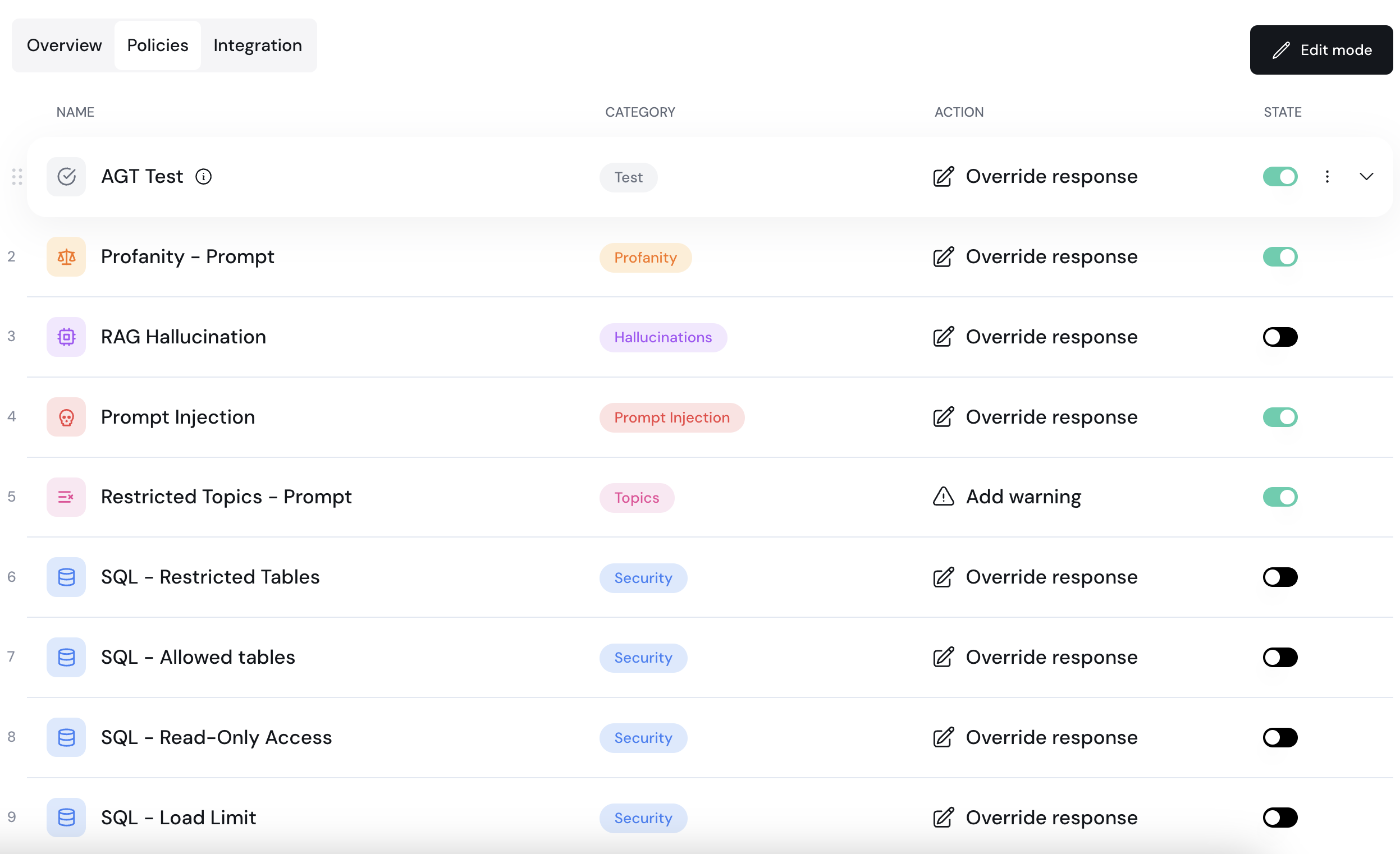 The Policies tab allows you to view the policies that are configured for this project. In each policy, you can see its name (e.g., SQL - Allowed tables), what category this policy is part of (e.g., Security), what action should be taken if a violation is detected (e.g., Override response), and a State toggle to turn this policy on or off.