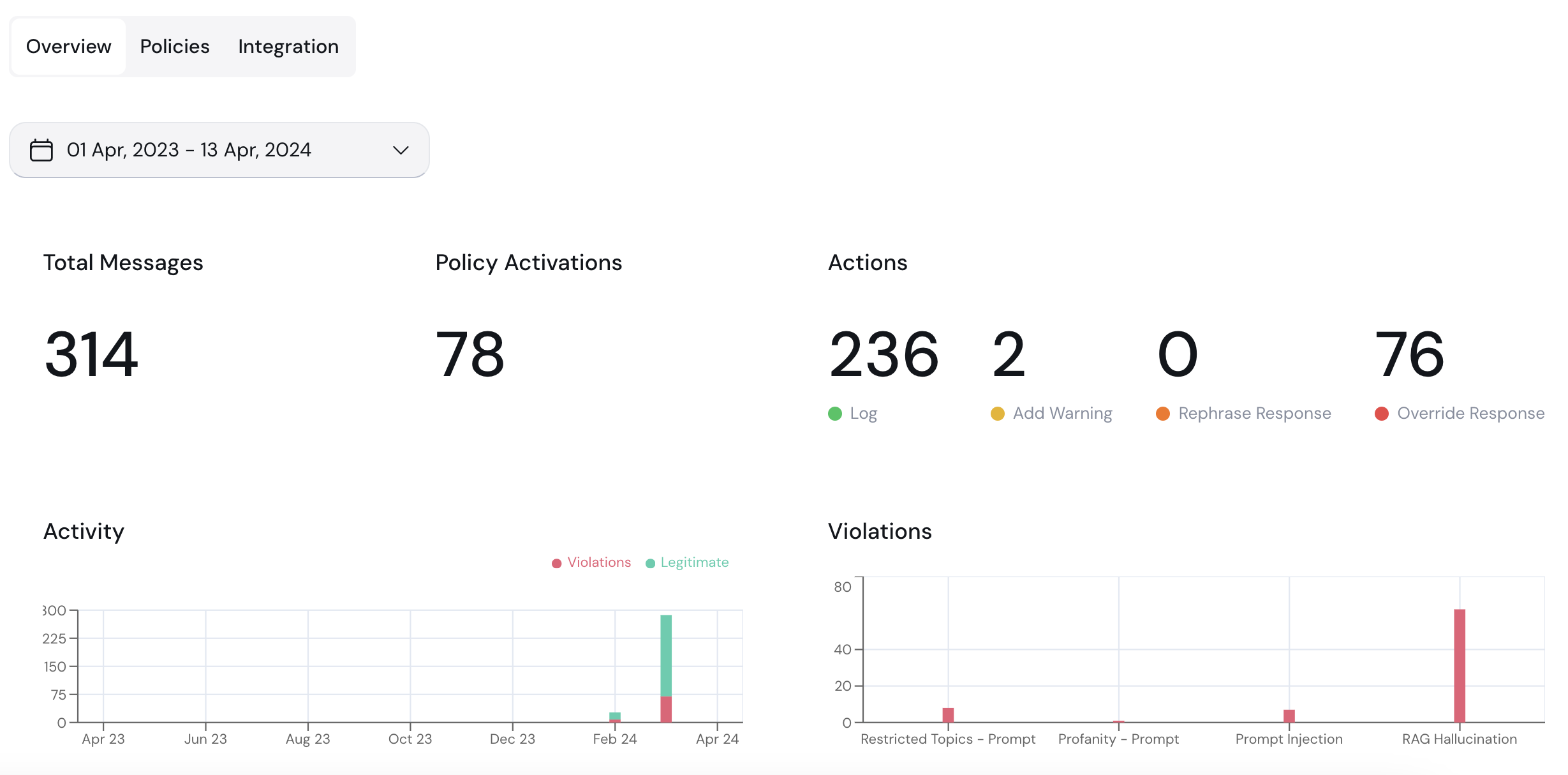 The Overview tab allows you to monitor the activity of your guardrails policies within this project. You can use the time period dropdown to select the time period you wish to focus on. If a specific message (e.g., a user’s question in a chatbot, or an LLM response) is evaluated by a specific policy (e.g., Prompt Injection), and the policy does not detect an issue, this message is tagged as legitimate. Otherwise, it is tagged as a violation.