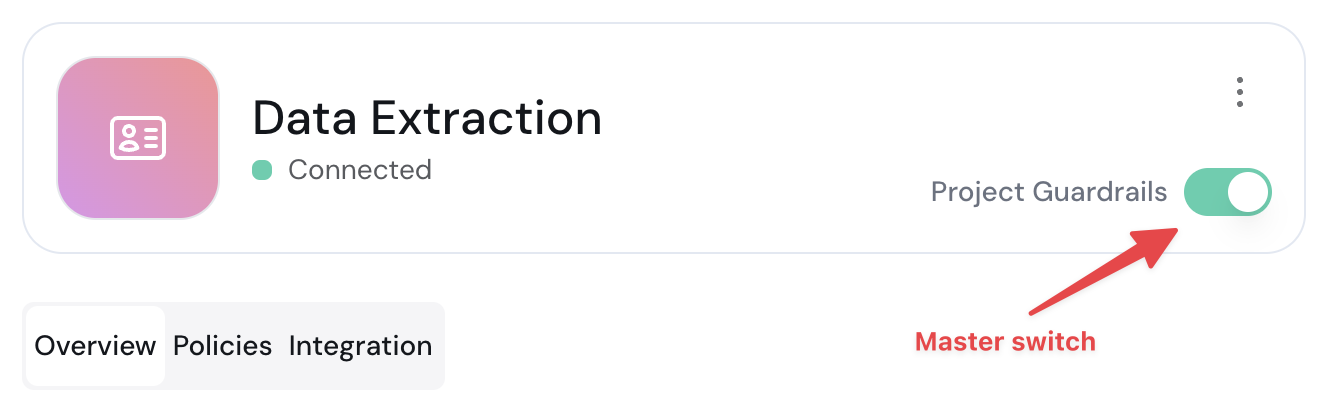 Each project includes a master switch that allows you to toggle all guardrails on or off with a single click. Notes:- When the master switch is turned off, the OpenAI Proxy proxies all requests directly to OpenAI, bypassing any guardrails policy.