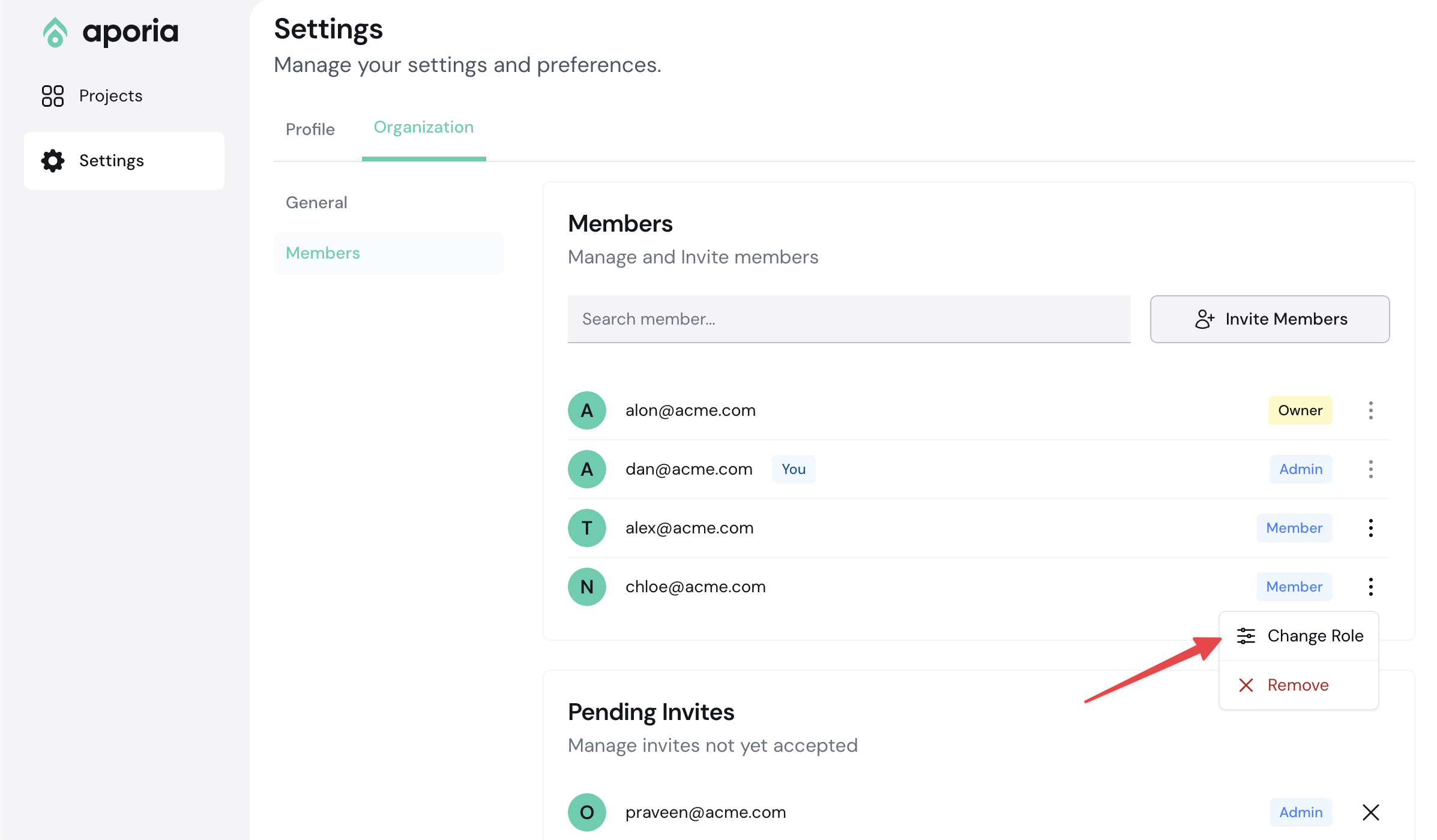 - You can view all pending invites in the Pending Invites tab. Once a member has accepted an invitation to the team, they’ll be displayed as team members with their assigned role