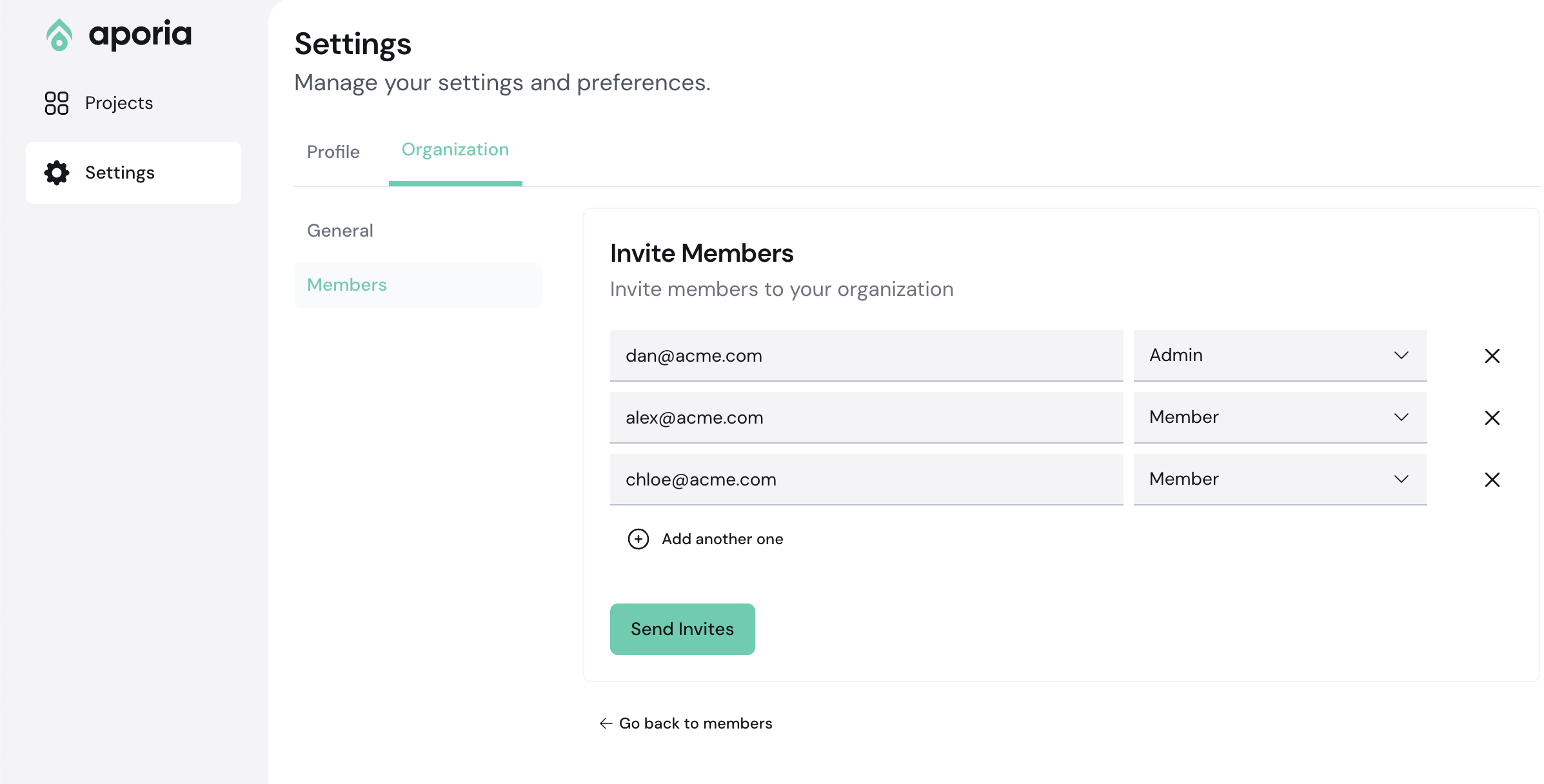 - Enter the email address of the person you would like to invite, assign their role, and select the Send Invite button. You can invite multiple people at once using the Add another one button: