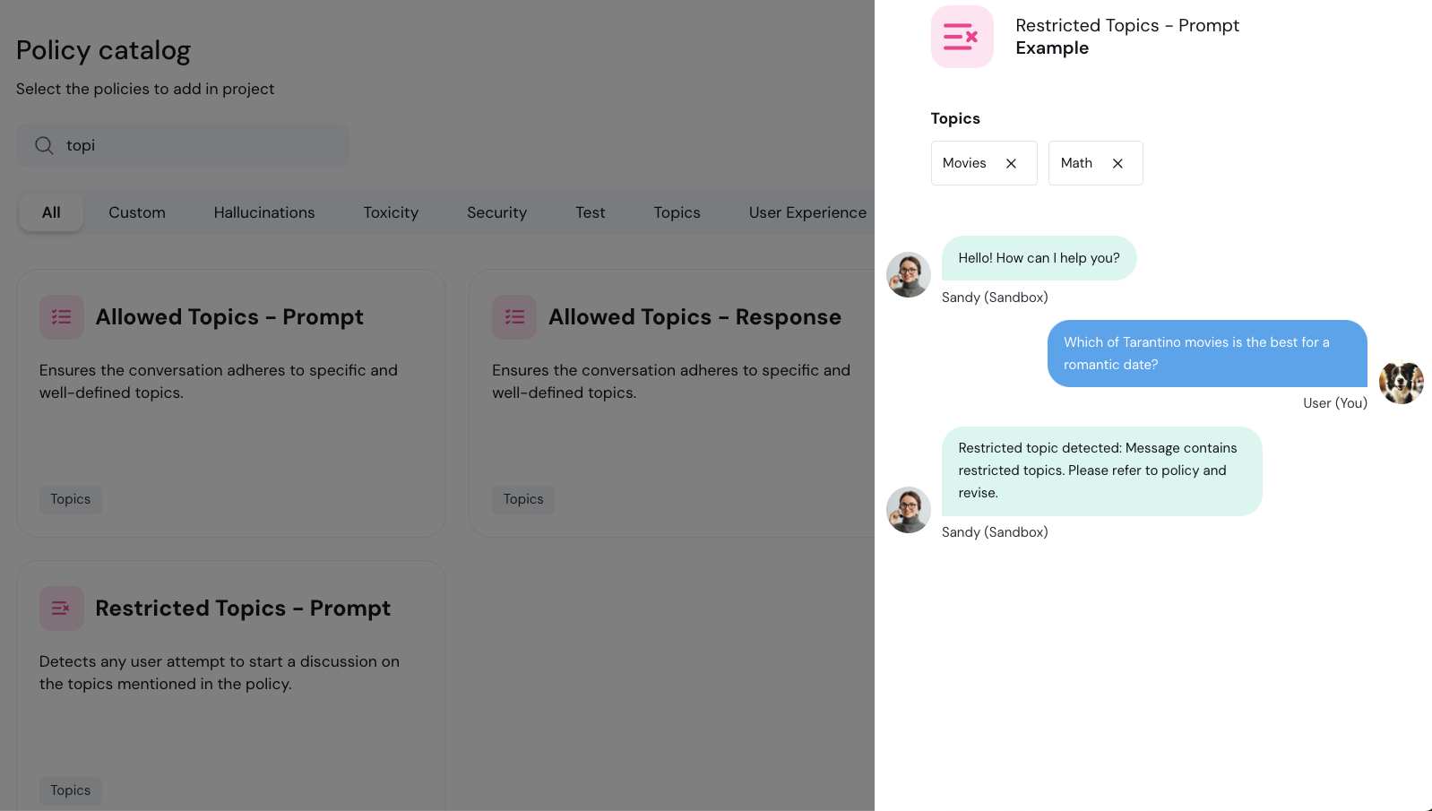 We’ve enhanced the examples section for each policy to provide clearer explanations. You can now view a sample conversation between a user and an LLM when a violation is detected and action is taken by Aporia. Simply click on “Examples” before adding a policy to your project to see which violations each policy is designed to prevent.