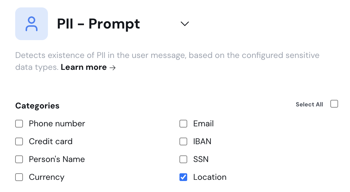 We have expanded PII detection capabilities with the addition of thelocation category, which identifies geographical details in sensitive data, such as ‘West End’ or ‘Brookfield.‘