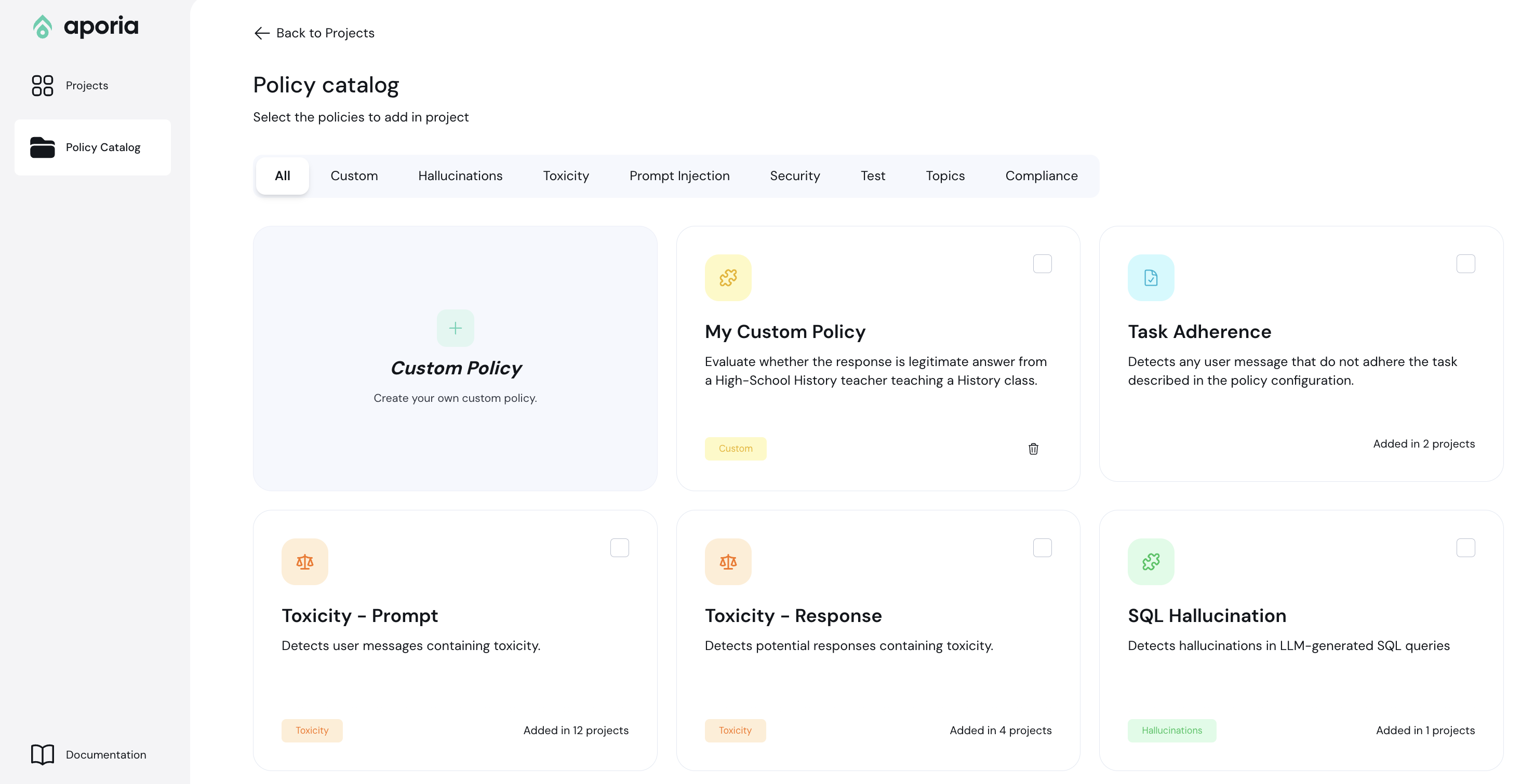 You can now access the Policy Catalog directly, allowing you to manage policies without entering a specific project and to add policies to multiple projects at once.