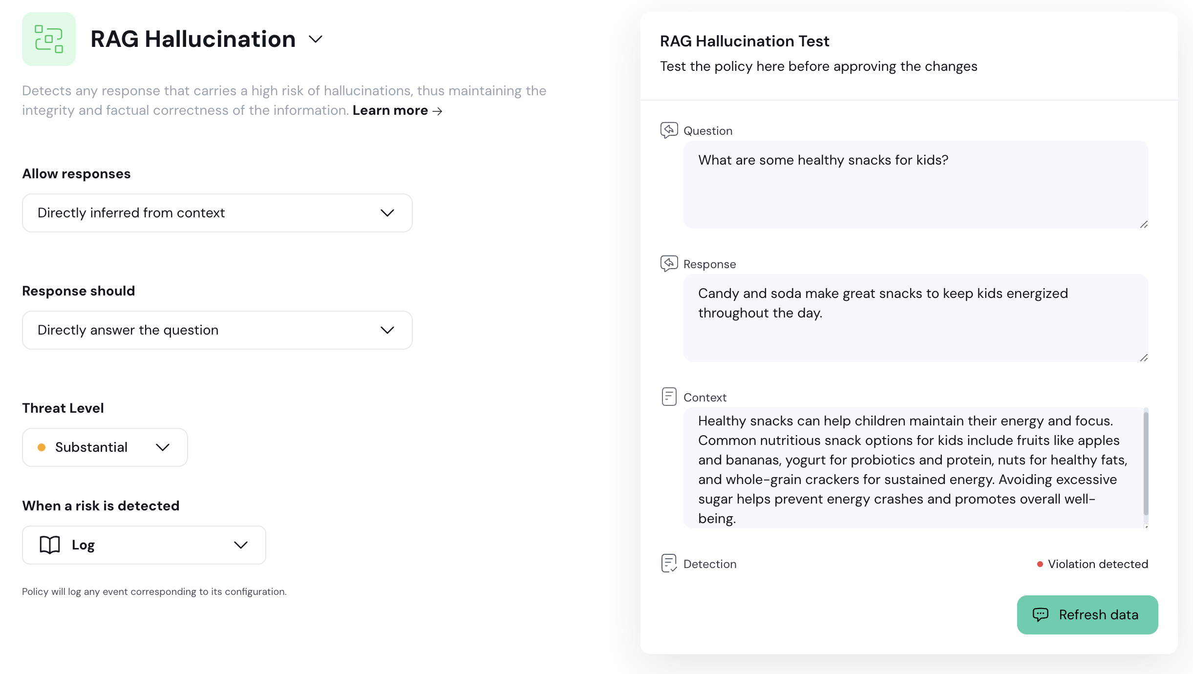 Our revamped Custom Policy Builder now empowers users with “Simple” and “Advanced” configuration modes, offering both ease of use and in-depth customization to suit diverse policy needs.RAG Hallucinations Testing