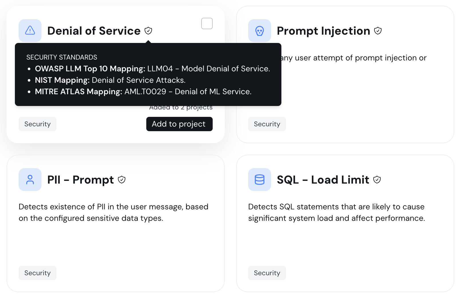 Every security policy now includes OWASP, MITRE, and NIST standards mappings on both policy pages and in the catalog.