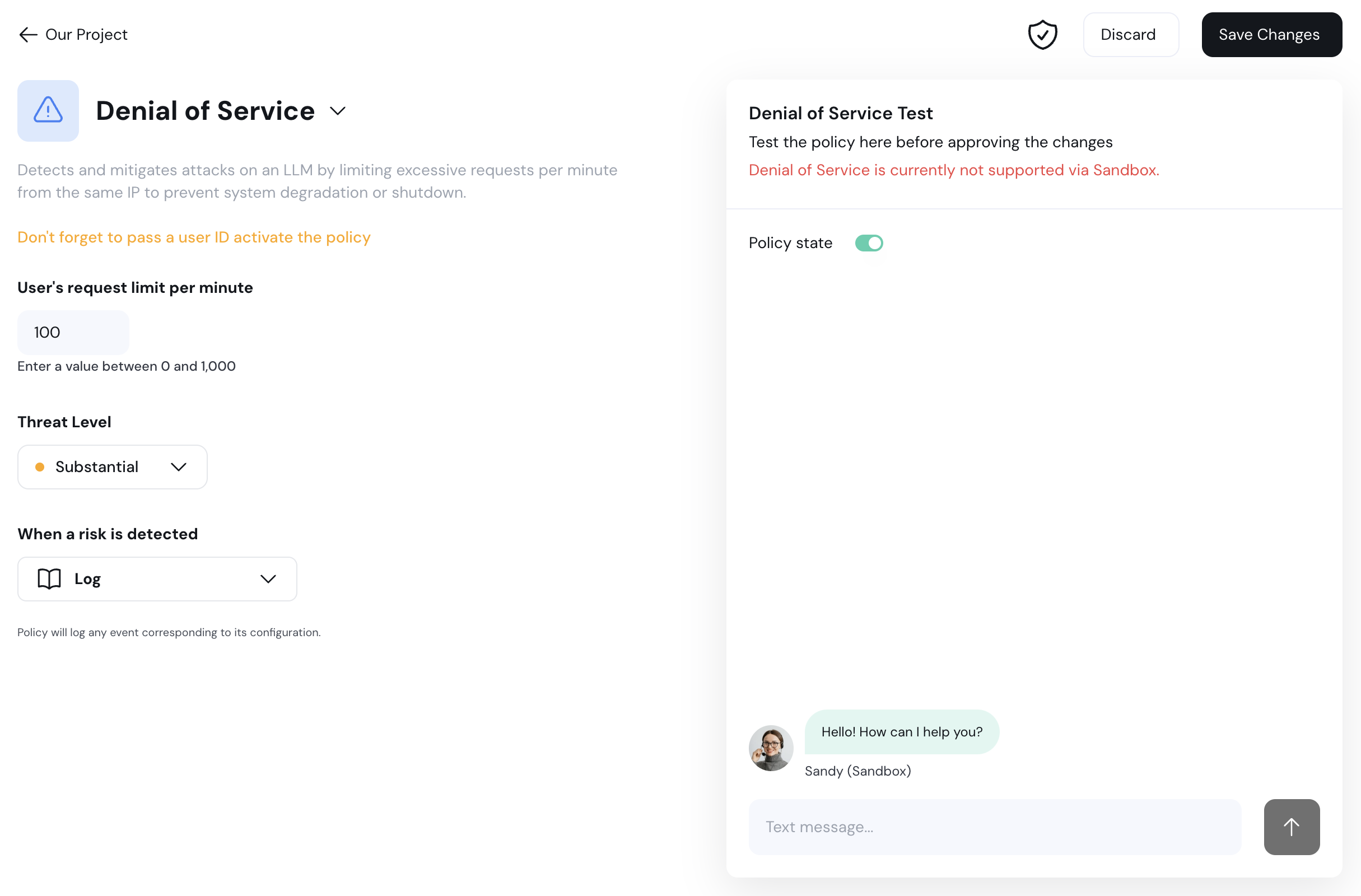 Protect your LLM from excessive requests! Our new DOS policy detects and blocks potential overloads by limiting the number of requests per minute from each user. Customize the request threshold to match your security needs and keep your system running smoothly.